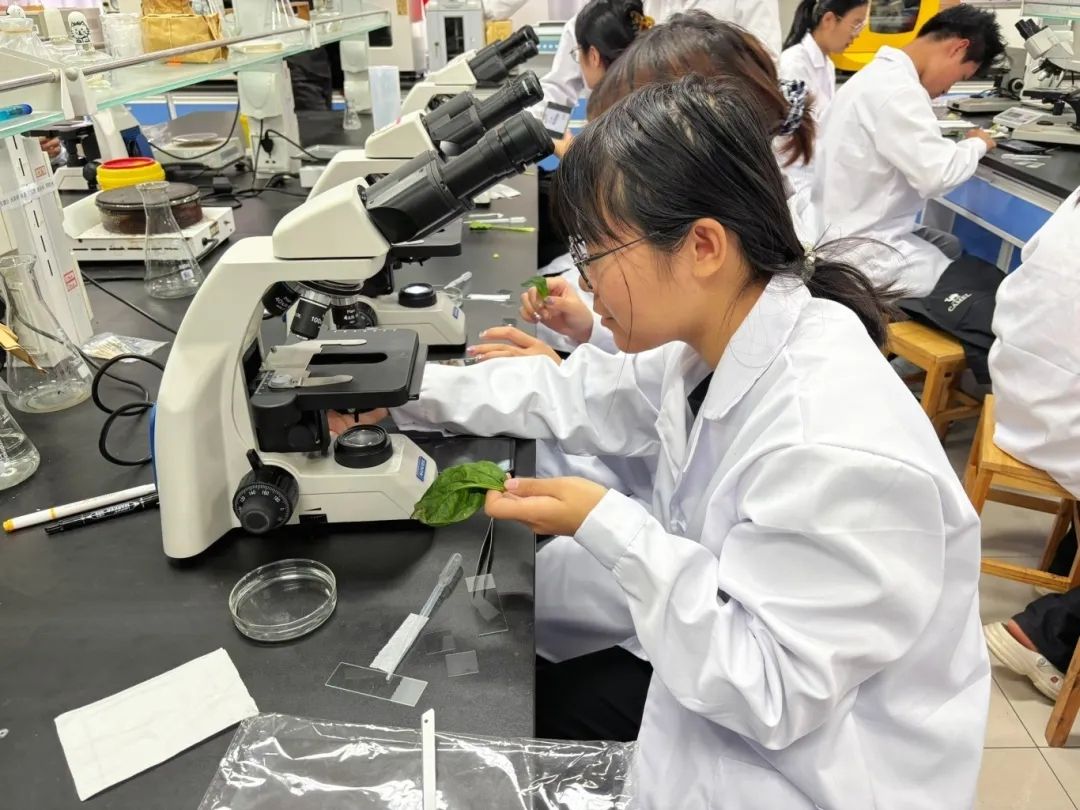 活动伊始,研习社成员为参与学生分发实验服,研习社负责人黄绪欣详细讲解了实验室安全操作规范及注意事项。实验环节中,学生们借助专业实验器材,分别对番茄、菠菜、土豆、芹菜等植物样本进行观察,直观认识到了不同植物的细胞结构特征,在动手实践中感受到了生物学科的独特魅力。