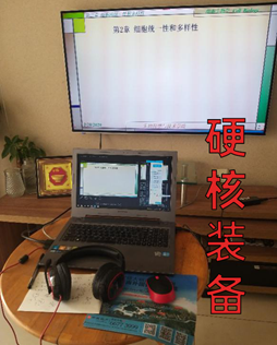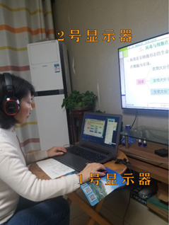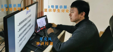 搬来的显示器+话筒组装成的硬壳装备,通过课堂派进行直播。正式上课时你们会看到这样的画面,屏幕2是学生看到的画面,即老师正常讲课展示的PPT;屏幕1用来关注学生的弹幕消息,或者QQ消息。双屏直播的最大的好处就是:学生端看到的只是PPT,在听老师讲课时不会分心,老师也可以随时关注学生端出现的问题,一旦有共性问题,老师可以随时将弹幕网页拖到分享的屏幕2上,与学生互动。
