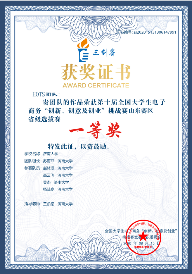 由王凯铭老师指导、苏雨菲同学为团队负责人的作品《智云药材—为打造优质云上中药材的航母级平台》荣获一等奖。“智云药材”是一个区域式的中药材产品营销服务商,解决了特色中药材产品存在的“优质中药材无品牌、销售渠道单一”、“质量不稳定、缺乏标准”等问题。项目以校、行、企+合作社的模式开展,打造出具有特色品牌的区域性产品,形成产业链发展趋势,为当地经济作物打开销路、提高效益,带动当地的经济发展,助力乡村振兴。