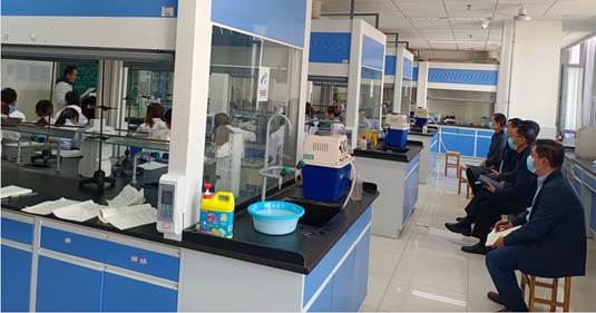 党委书记朱帮全、院长何文兴、副书记孙翔玲、副院长李强、秦晓春、教学管理办公室副主任褚海培在特教楼本科实验室,分别对江成世、朱孔凯两位老师的《药物化学实验》课程,以及李玉梅、杨新超两位老师的《蛋白质与酶工程实验》课程进行听课、巡课。