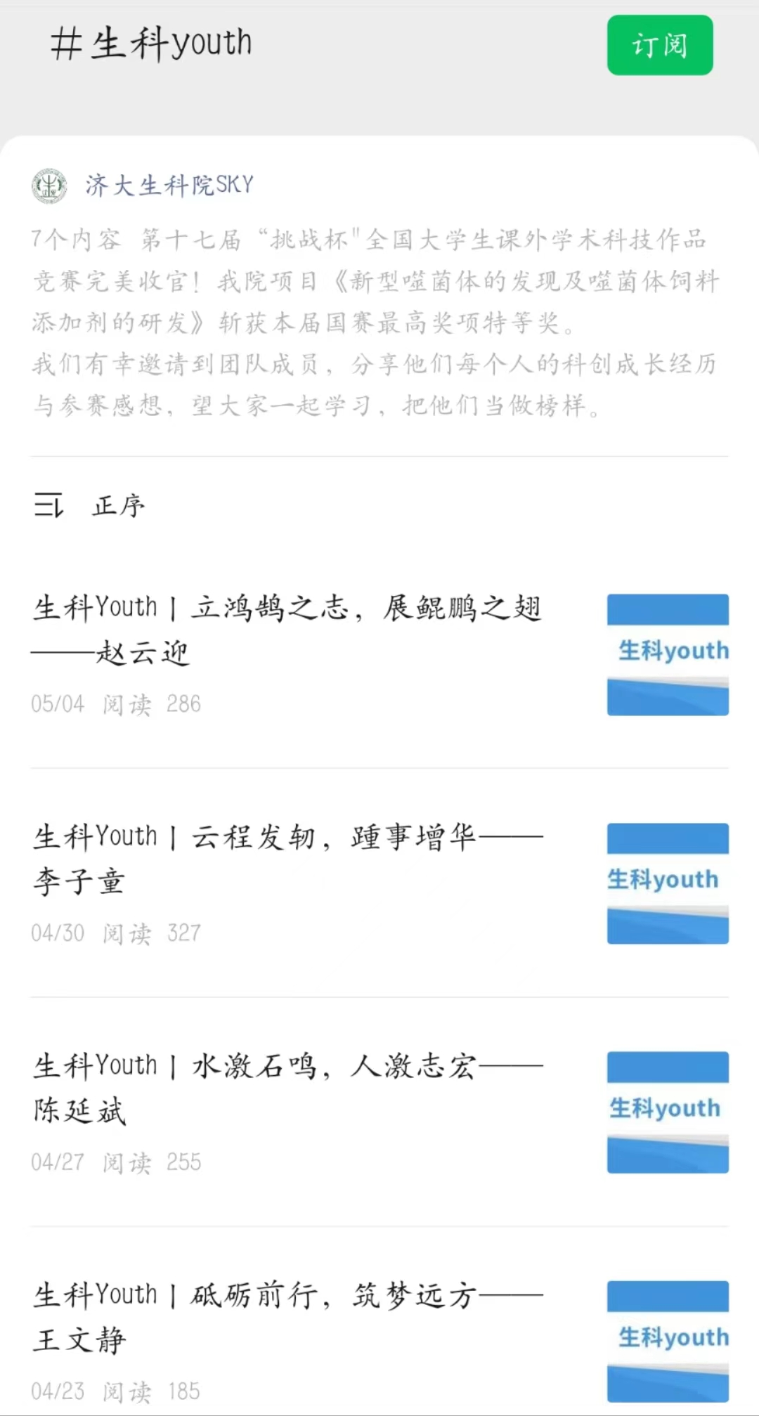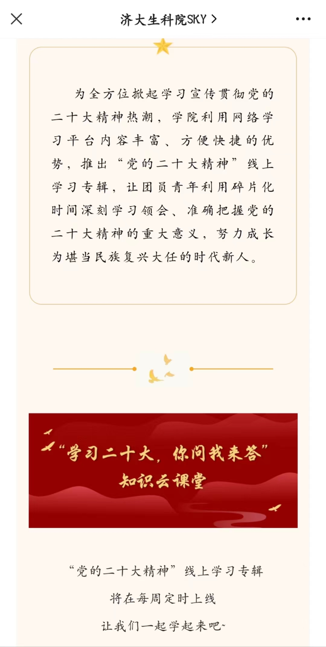 公众号推出各类线上课程,在“济大生科院SKY”平台共发布文章197篇,收录并设立十个专辑,内容涵盖思政引领、科学创新、学风建设、志愿公益、开云体育App