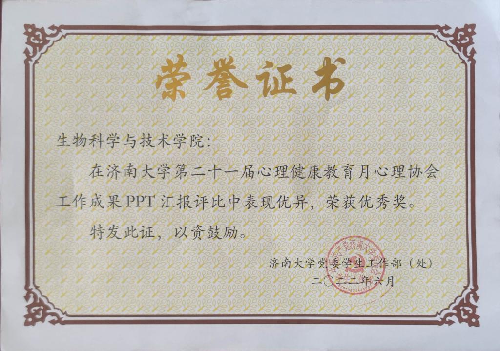 做“科创筑新梦,青春向未来”专题讲座,通过新媒体平台发布“科创Zone”,宣传科创赛事,讲解科创知识。此外,在第十三届“挑战杯”山东省大学生创业计划竞赛中获得金奖3项;在第八届山东省“互联网+”大学生创新创业大赛中获得主赛道金奖1项、银奖1项,产业命题赛道金奖1项;在第九届山东省科技创新大赛中获二等奖1项、三等奖1项;在全国大学生生命科学竞赛(2022,创新创业类)中获一等奖2项、二等奖1项、三等奖3项;在全国大学生生命科学竞赛(2022,创新创业类)山东省赛区决赛中获得一等奖1项、二等奖2项、三等奖1项;在全国大学生生命科学竞赛(2022,科学探究类)中获得三等奖4项;在全国大学生生命科学竞赛(2022,科学探究类)山东省赛区决赛中获得一等奖1项、二等奖3项、三等奖3项;在第十四届山东省大学生科技节-山东省大学生生物学大赛中获得一等奖4项、二等奖3项、三等奖6项。本年度共获大学生科创省级及以上奖励的奖项44项,获奖学生254人次。