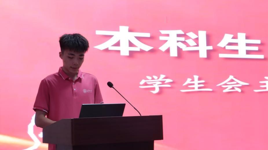 学生会主席生物2302班丁宝鹏作为在校生代表发言,他结合自身经历,分享了个人大学生活的感悟,与新生共勉:一要心系家国,共绘蓝图,于奋斗中领悟自我的无限可能;二要砥砺前行,无惧风雨,于挑战之巅铸就自我价值的光辉;三要宽容如海,助人自助,于奉献的旅程中探索生命的意义。